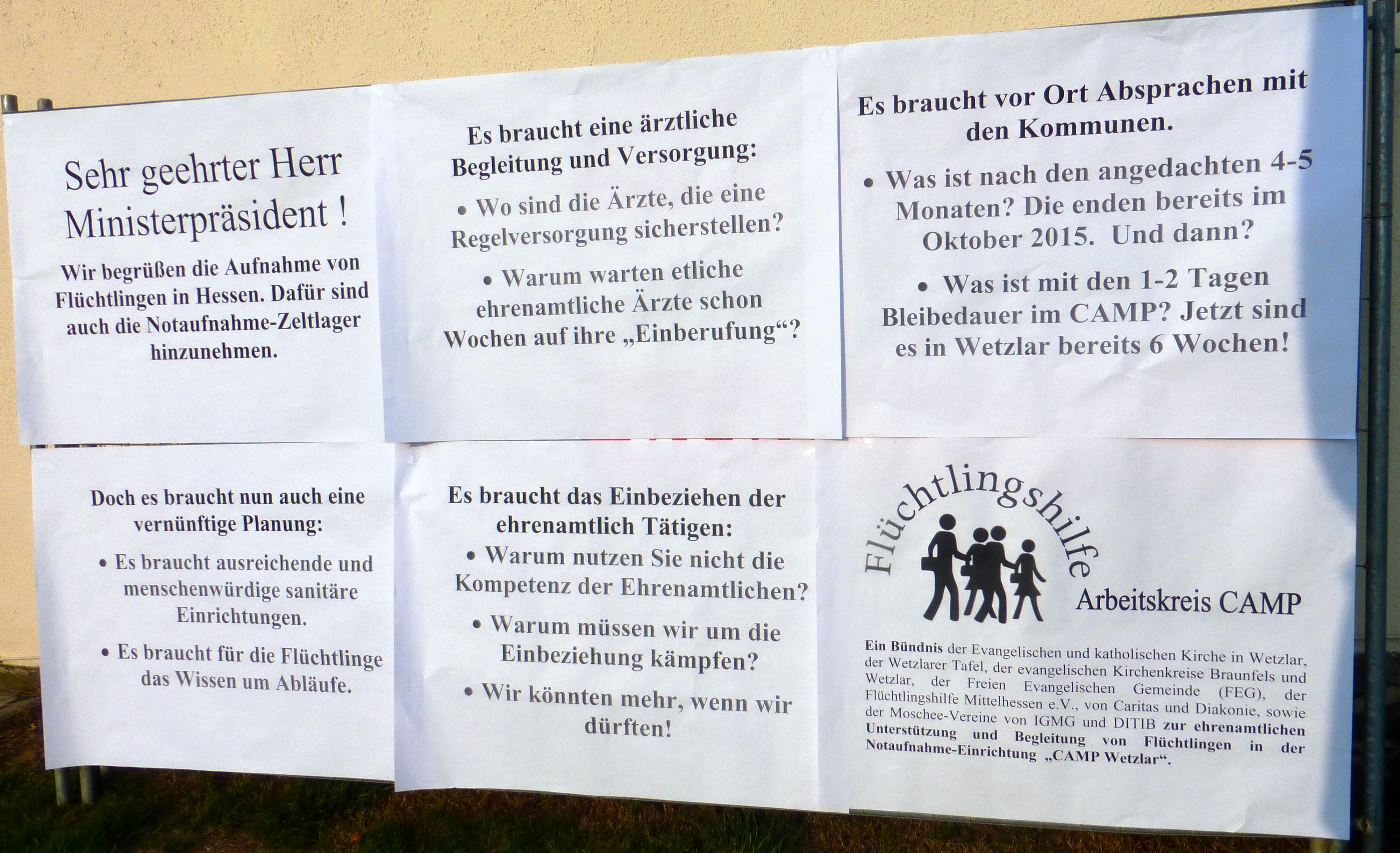 Ausreichende und menschenwürdige sanitäre Einrichtungen mahnte der kirchliche „Arbeitskreis CAMP“ der Flüchtlingshilfe mit an Zäunen aufgehängten Plakaten an. Gefragt wird, was im Oktober geschieht, nach einer Verweildauer der Flüchtlinge von bereits vier bis fünf Monaten. Kritisiert wird die unzureichende ärztliche Versorgung, obwohl Ehrenamtliche bereit stehen. „Warum müssen wir als Ehrenamtliche um unsere Einbeziehung kämpfen?“ fragt der Arbeitskreis ganz allgemein. Dessen Sprecher Harald Würges bat den Regierungschef, sich dafür einzusetzen, dass die Bedingungen für die Ehrenamtlichen erleichtert werden: „Wir sind etwa 300 Leute. Wir können mehr. Wir haben Cafés eingerichtet und kümmern uns um die Leute.“ Und, im Hinblick auf die rechtsextremen Krawalle im sächsischen Heidenau: „Noch ist die Stimmung in Wetzlar positiv. Das wollen wir aufrechterhalten.“ Mit Bouffiers Antwort, dass nicht immer alles machbar sei und dass kanalisiert werden müsse, weil die Abläufe hochkomplex seien, sind die ehrenamtlichen Helfer nicht zufrieden.