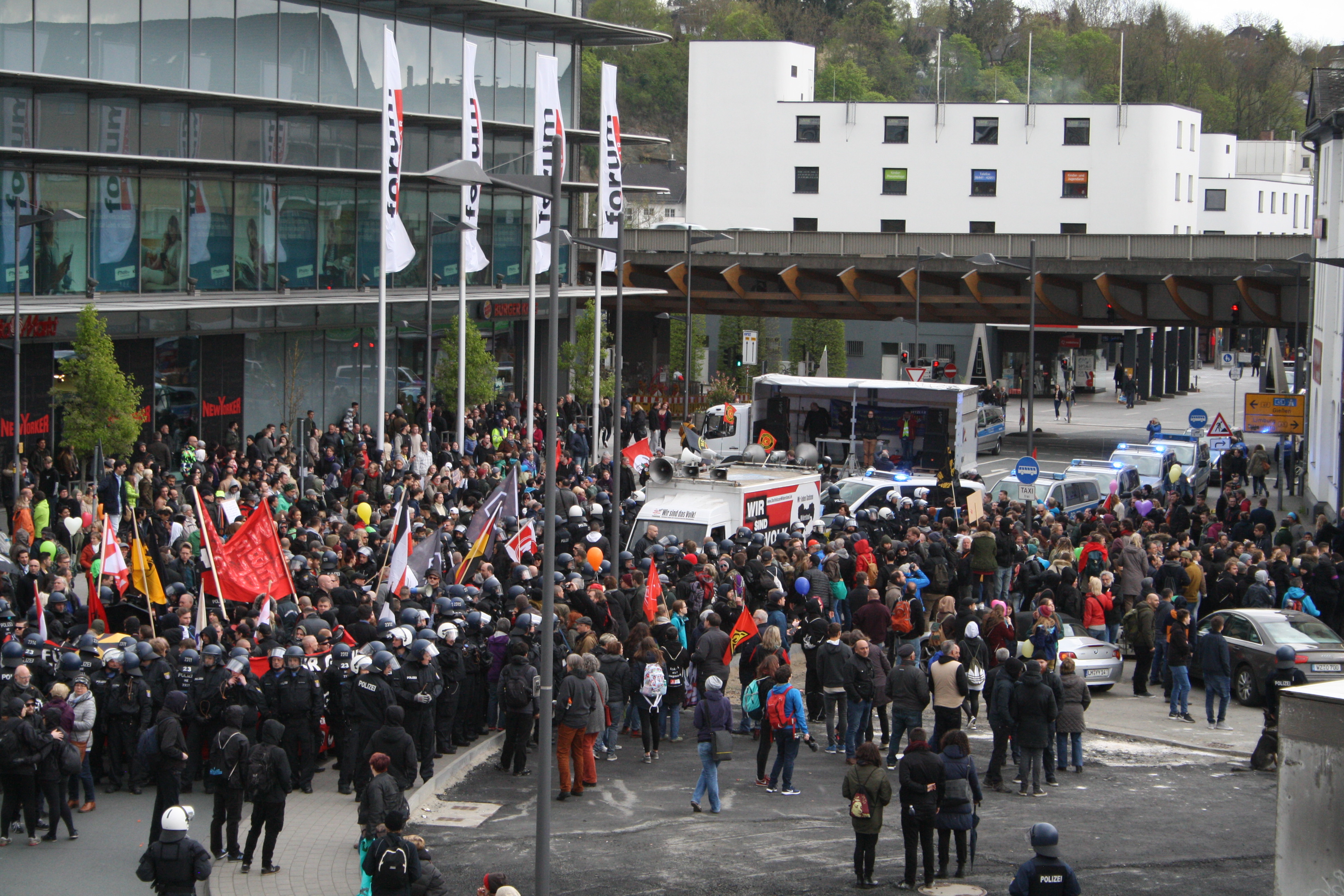 Rund 800 Gegendemonstranten standen nach Polizeiangaben vor dem Wetzlarer Bahnhof etwa 100 Rechtsaktivisten gegenüber.