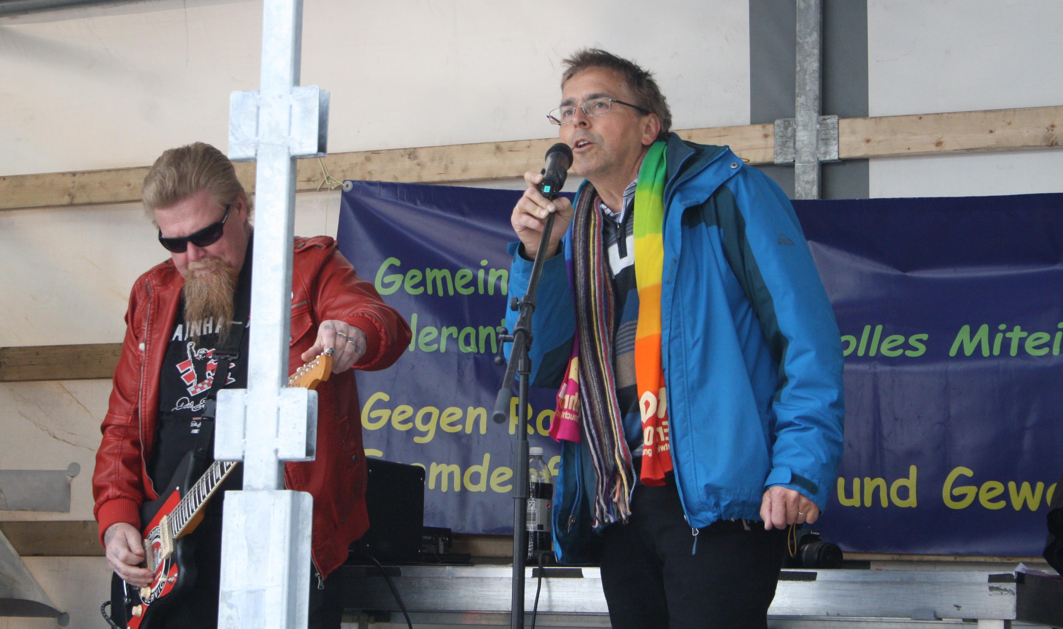 Neben ihm der finnische Rockgitarrist Pontus BackDie Anskar-Kirche Niedergirmes, die auf ihrem Gelände ein Parkplatzfest feierte, hatte den finnischen Rock-Gitarristen Pontus Back eingeladen. Er gestaltete das Kulturprogramm der Kundgebung mit und erzählte davon, wie er Christ geworden war.