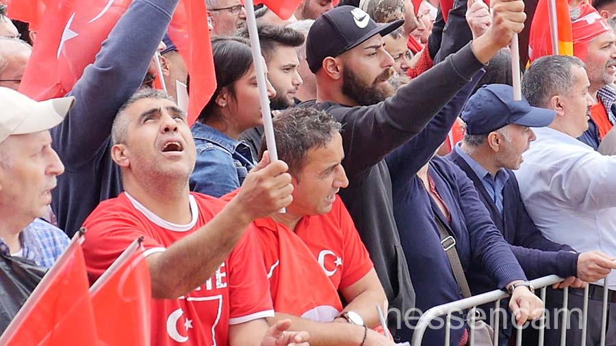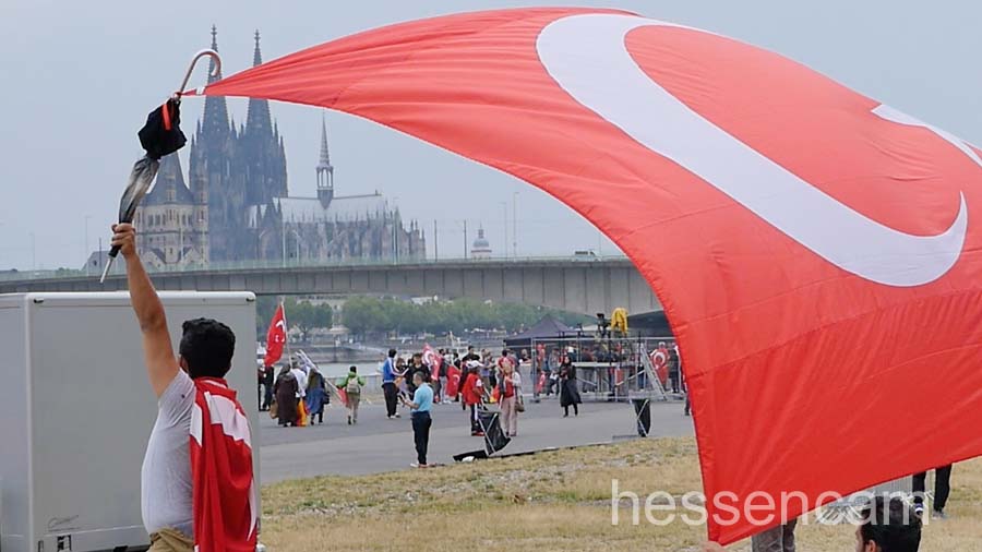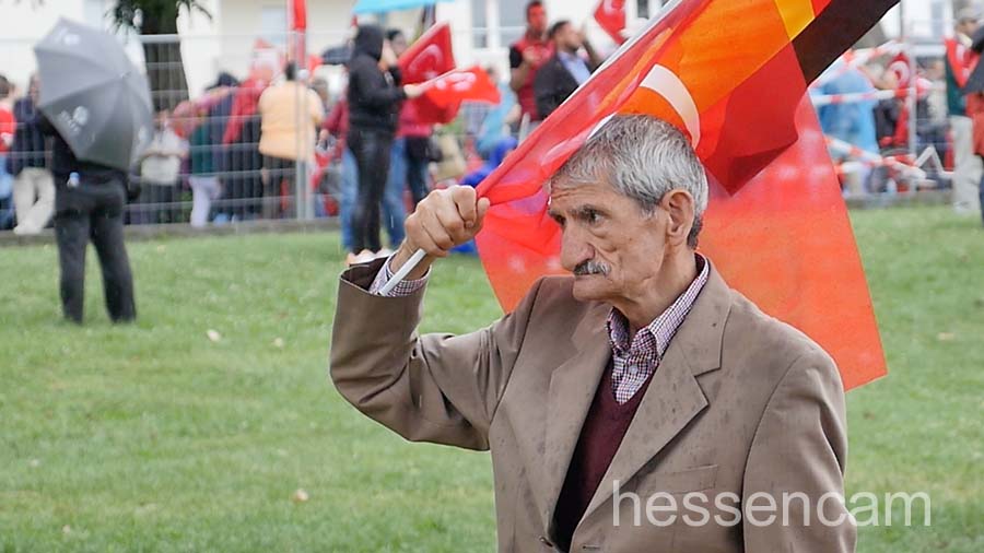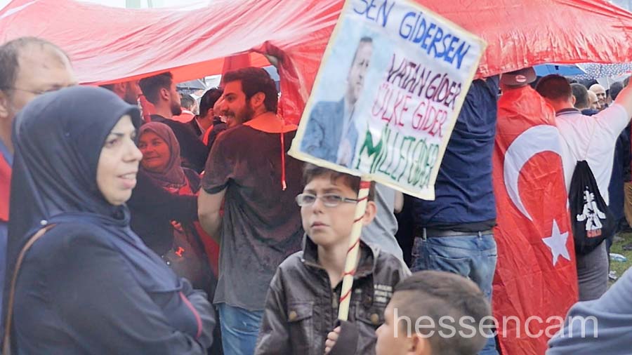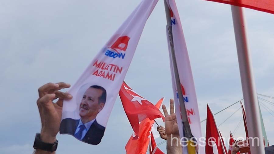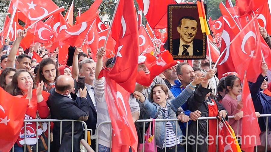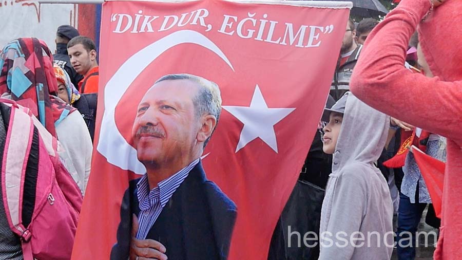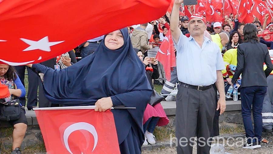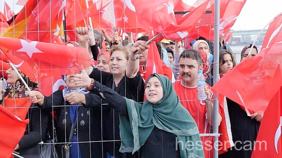 Recep Tayyip Erdogan feierte man als Held der Demokratie. Tausende schwenkten ihre Fahne, wenn „sein Lied“von dem Schlagersänger Uğur Işılak angestimmt wurde. Viele waren verstimmt, dass  „ihre“ Staatspräsidenten nicht per Liveschaltung auf der Videoleinwand zu sehen und zu hören war. Die deutschen Gerichte hatten es nicht erlaubt.