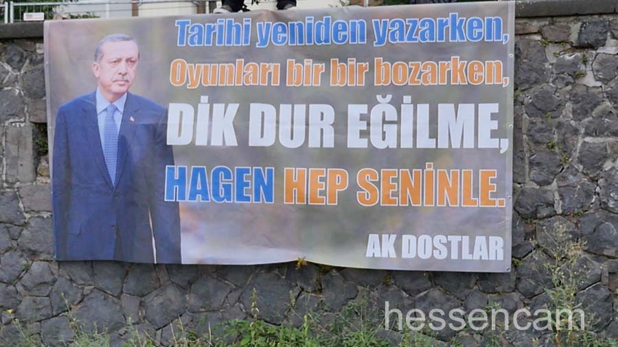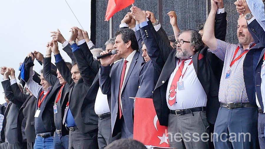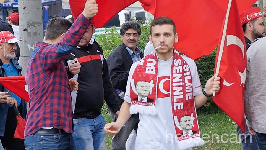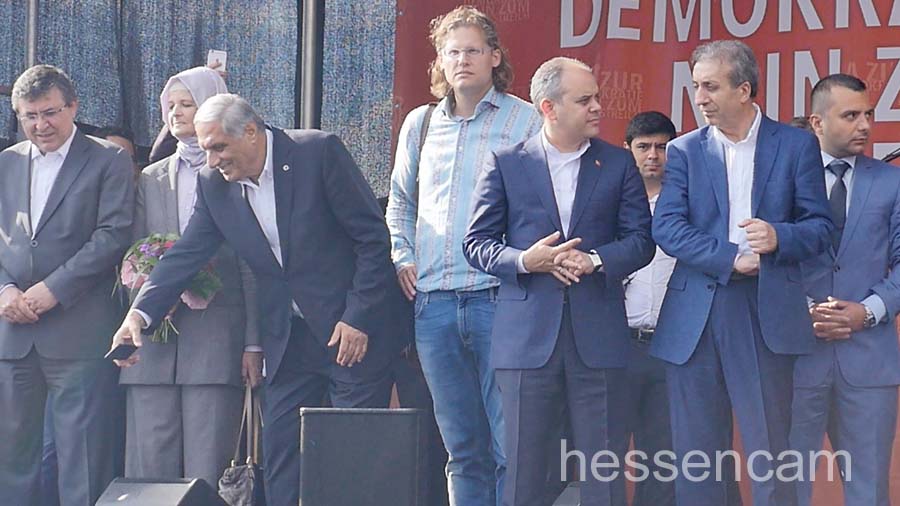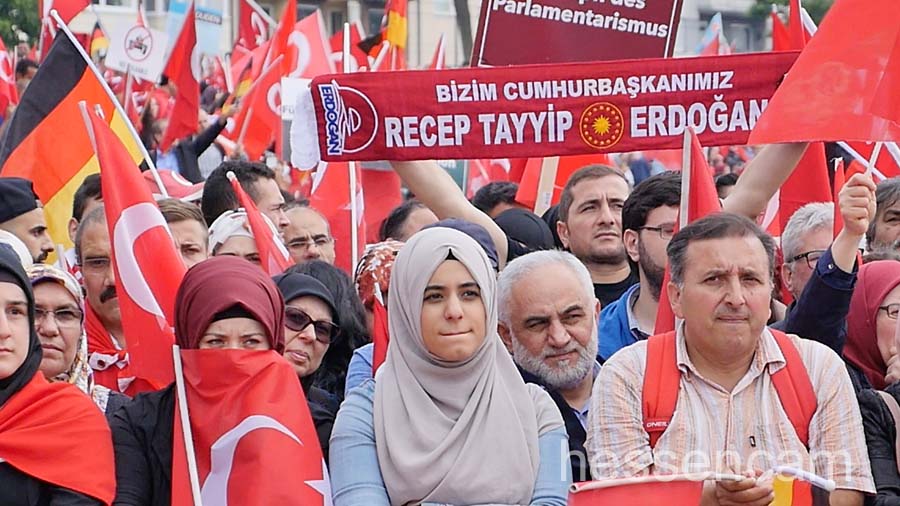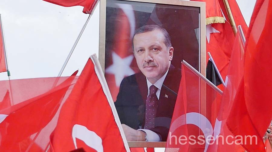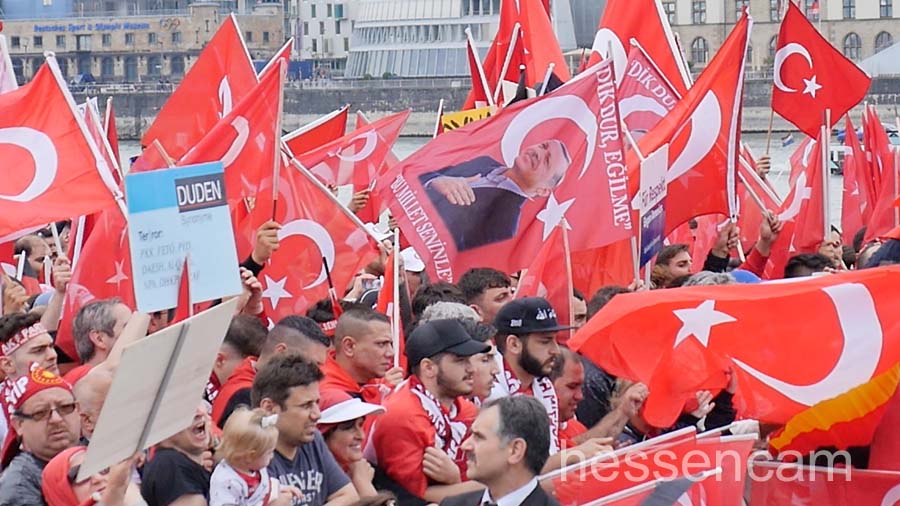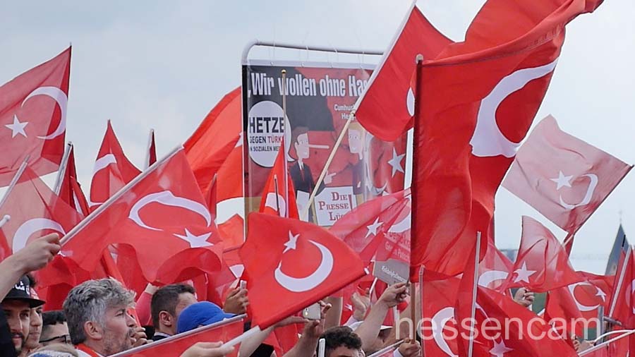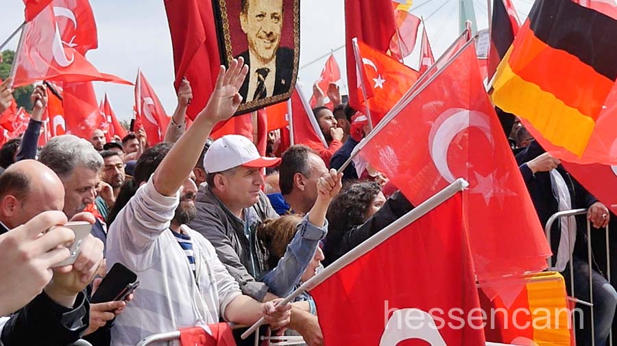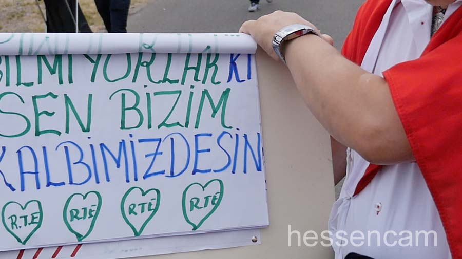 Recep Tayyip Erdogan feierte man als Held der Demokratie. Tausende schwenkten ihre Fahne, wenn „sein Lied“von dem Schlagersänger Uğur Işılak angestimmt wurde. Viele waren verstimmt, dass  „ihre“ Staatspräsidenten nicht per Liveschaltung auf der Videoleinwand zu sehen und zu hören war. Die deutschen Gerichte hatten es nicht erlaubt.