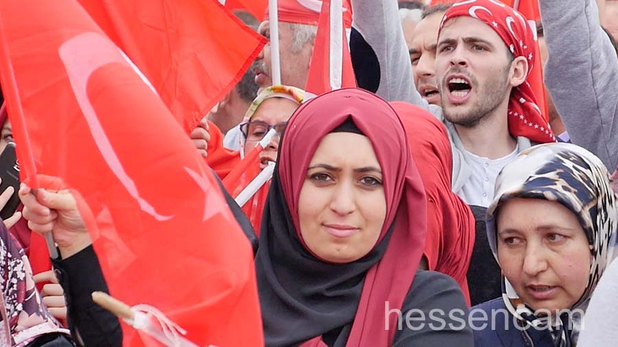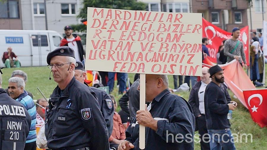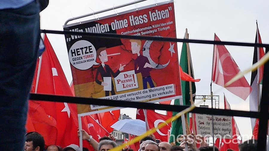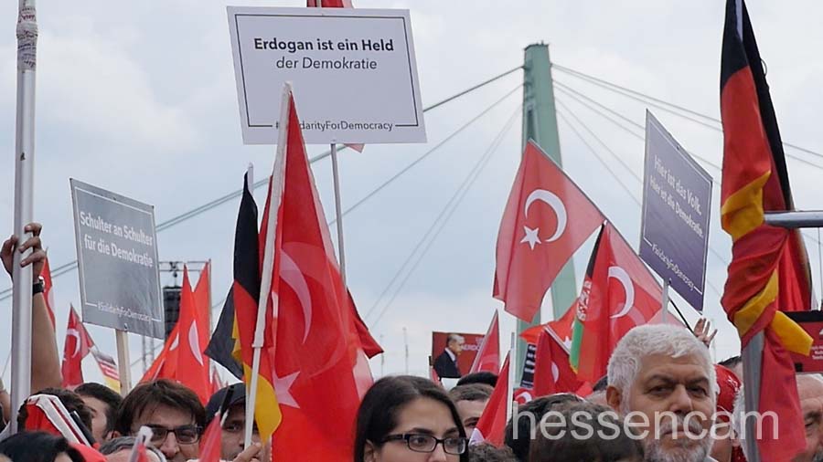 „Wir sind das Volk, Lügenpresse, Vaterlandsverräter“… solche Begriffe kennt man eher von den Pegida-Demos in Dresden. Die national geprägten Begriffe waren diesmal auf der Kundgebung am Sonntag in Köln zu hören, bzw. auf einigen Demonstrationsschildern zu sehen. Viele junge Leute, die sicherlich in Deutschland aufgewachsen sind, folgten dem Ruf der türkischen  AK Partei. Ohne Hemmungen reihten sie sich ein in das nationale und völkische Ambiente ein – zwischen Personenkult und nationaler Volksverherrlichung.  Aber nicht nur nationale Sprechgesänge waren zu hören. Der Ruf „Gott ist groß“ (Allahu akbar) begleitete die Veranstaltung und gab der ganzen Veranstaltung einen „religiösen Segen“.