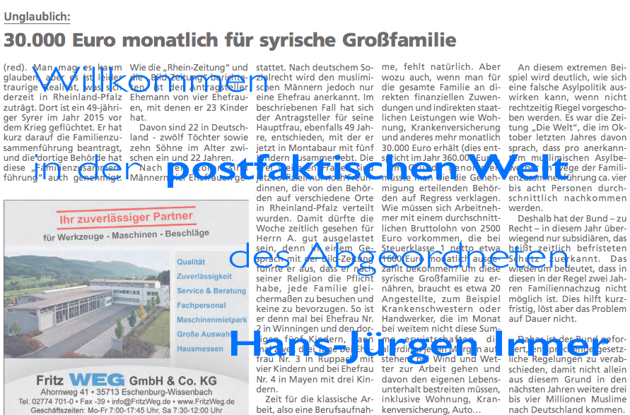 Sein Grundanliegen in dem vorliegenden Artikel: Kritik an der deutschen Asylpolitik und konkret die Verhinderung des Familiennachzugs „von drei- bis vier Millionen Muslimen“. Als abschreckendes Beispiel wählt er eine Familie aus Rheinland-Pfalz, die mit 23 Kindern und 5 Erwachsenen im Jahre 2015 eingereist ist. Vier Ehefrauen, 23 Kinder und ein Ehemann/Vater.