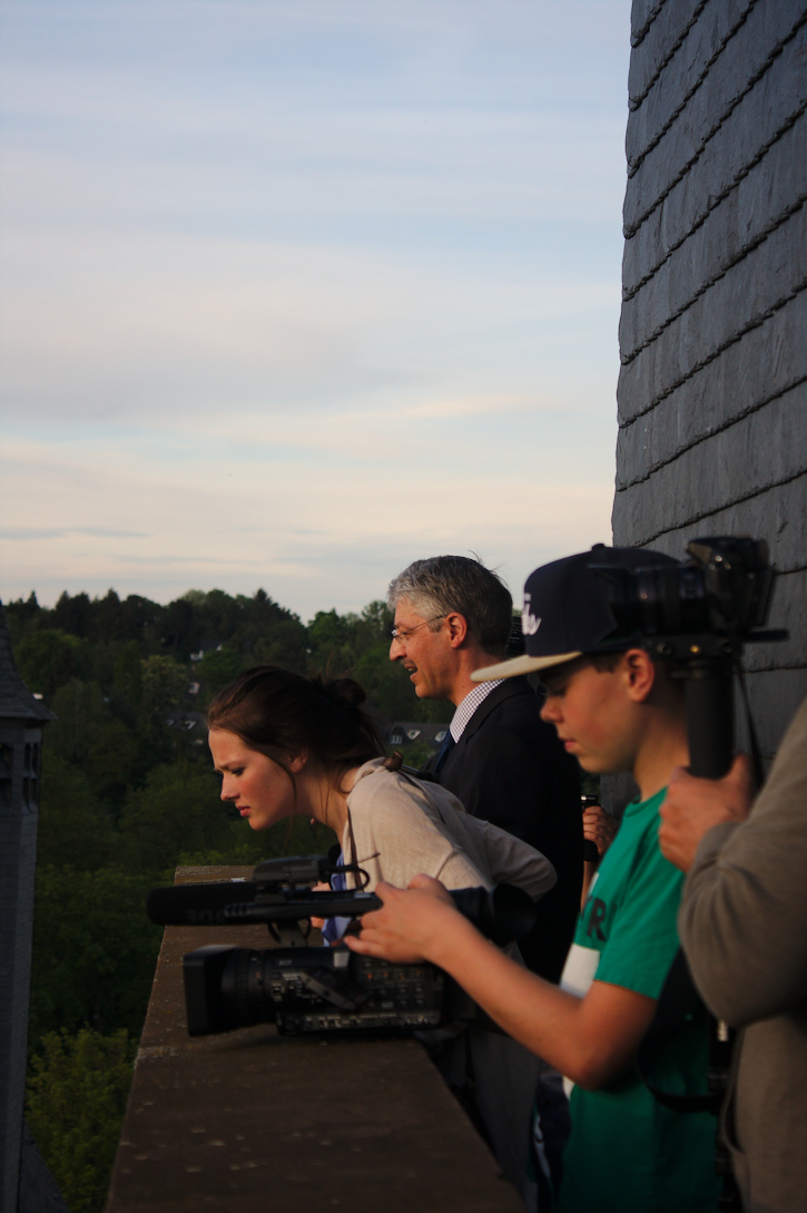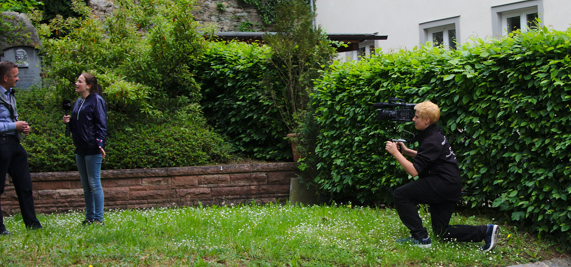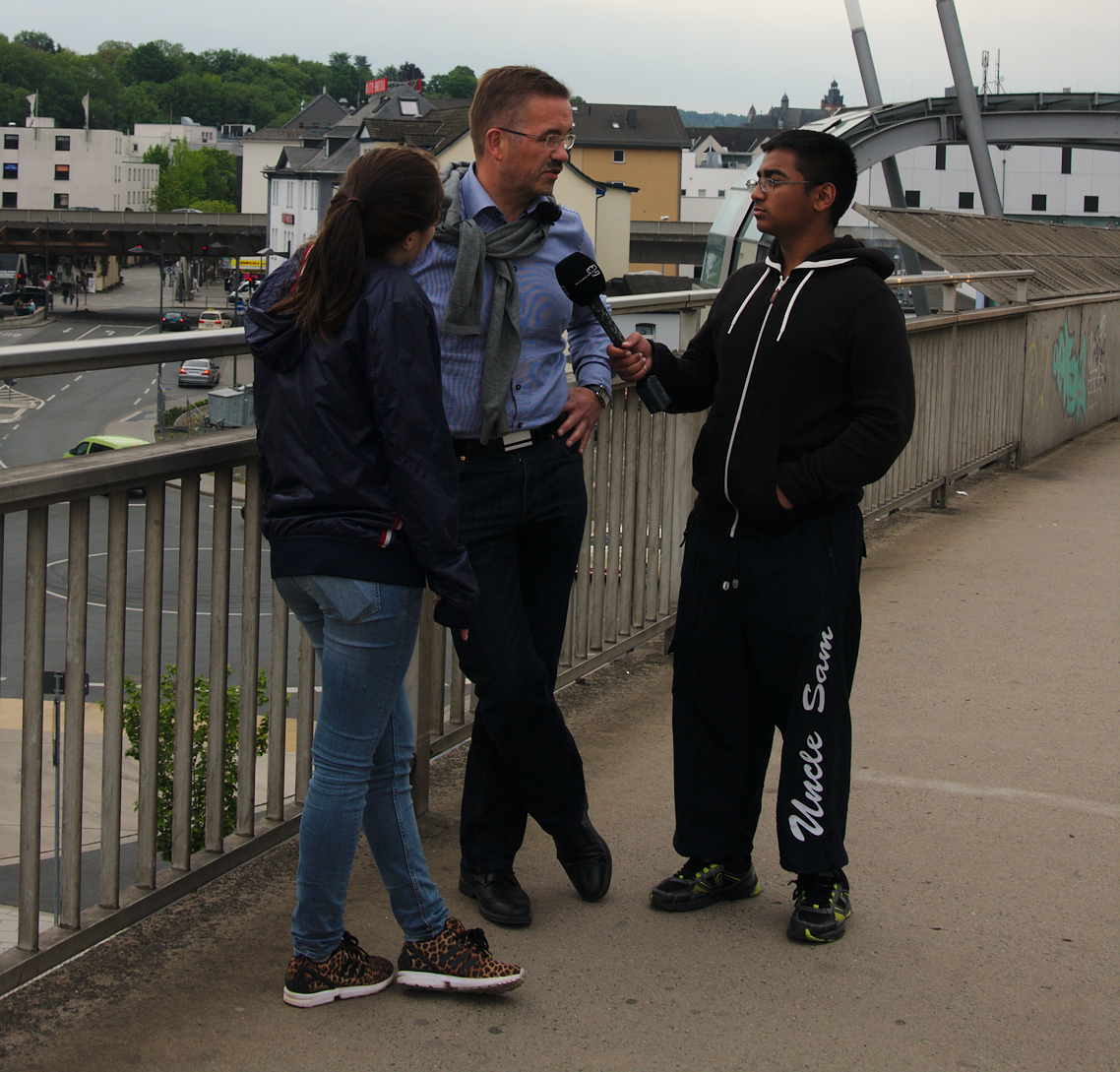Dr. Matthias Büger (FDP) und Manfred Wagner (SPD) nahmen sich fast zwei Stunden Zeit, die zahlreichen Fragen der jungen ModeratorInnen, Omer und Lea, zu beantworten. Drei Kameraleute haben den kritischen Stadtrundgang festgehalten. Nun muss alles so zusammengeschnitten werden, um es bis zum Ende der Woche präsentieren zu können.