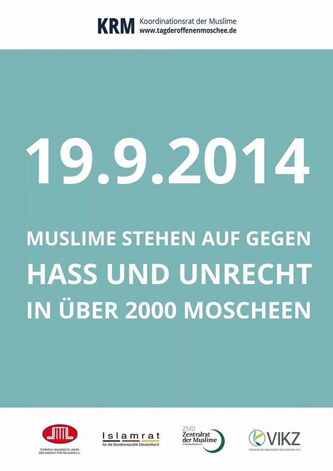 Wir, die im KRM organisierten Religionsgemeinschaften (DITIB, Islamrat, VIKZ und ZMD) und ihre angeschlossenen Landes- und Regionalverbände, wollen am 19.09. in über 2000 Moscheen eine bundesweite Aktion durchführen, anschluss an das muslimische Freitagsgebet mit einer Mahnwache und Friedensgebet gemeinsam mit Bürgerinnen und Bürgern vor Ort begleitet wird.