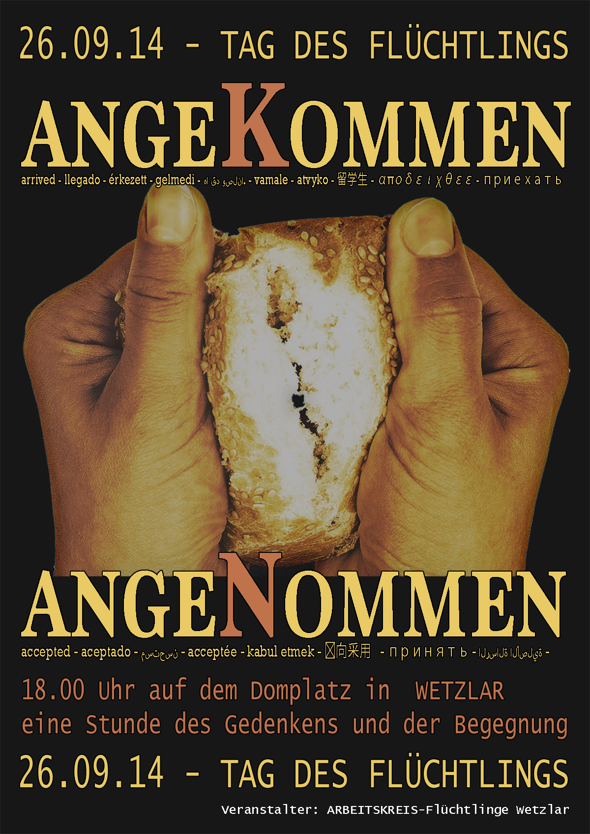 Unter dem Motto „angekommen – angenommen“ wollen die Veranstalter die Schicksale der in unserer Region lebenden Flüchtlinge aufnehmen. Dazu haben sie Flüchtlinge aus allen 20 Gemeinschaftsunterkünften sowie ehrenamtliche Begleiter des Arbeitskreises Asyl zu einem Gedenken eingeladen. Besonders willkommen sind Bürgerinnen und Bürger aus Wetzlar und Umgebung, die sich ein Bild von der Situation der Flüchtlinge machen wollen. Erlebnisberichte von Flucht und Vertreibung, Berichte aus den Unterkünften, von der Unberechenbarkeit der Asylverfahren bis hin zur erneuten rassistischen Verfolgung prägen das Gedenken. Sind die in unserer Region angekommenen Flüchtlinge auch angenommen und akzeptiert, diese Frage treibt die Veranstalter um und darum wollen sie werben.